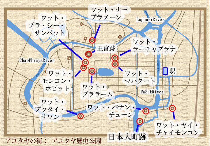 チャオプラヤー川とその支流(オールド・ロッブリー川、バサック川)に囲まれた中に、アユタヤの街がありますが、王朝当時、ビルマと度々戦い、多くの建物が破壊されてしまっています。