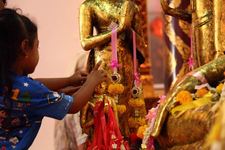 仏像には金箔片を貼ってお参りします。子供が金箔貼ってます。これがうまくくっつかず、はがれてしまったりして中々うまくいかないんですね。 |
