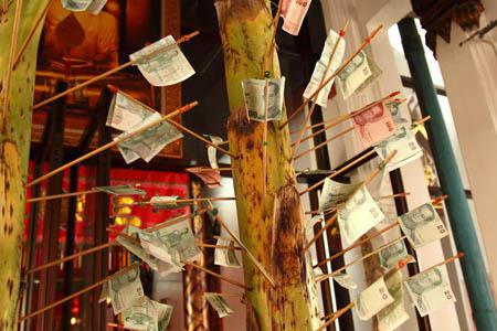 タイでよく見るお札のお布施。このようにお札を棒に挟んで差しておくんですね。 |