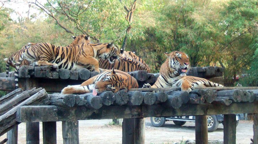 (小高い?木作りのスペースにトラが群れて寝ています。寝てる姿は超大型のイヌ、という感じで可愛らしいんですが、その貫禄には近寄りがたいですね。)