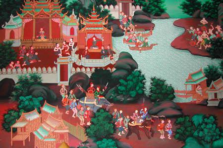 壁には、昔の生活や戦いの絵が描かれています。 |