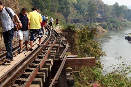クウェー川鉄橋駅と同じように、観光客が線路の上を歩いて楽しんでますね。 |
