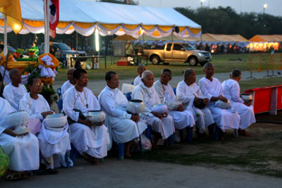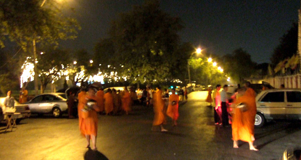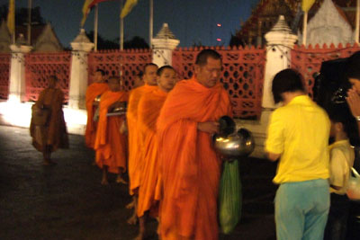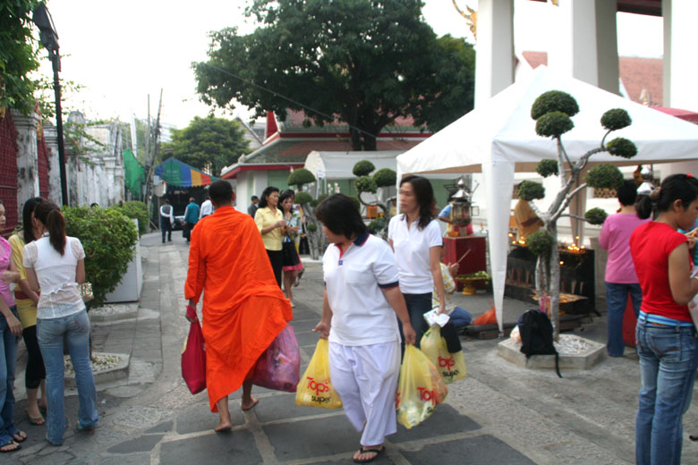 タンブンする人々。お坊さんはバートと呼ばれる入れ物を持っています。