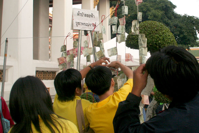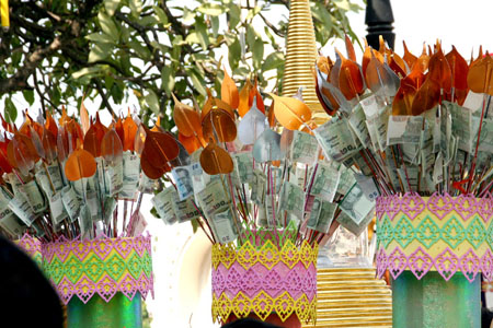 チェンマイの新年でも見られましたが、お札のついたものがお供えされてます。