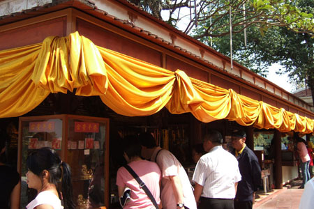 祭壇の前には、仏像があり、人々が金箔を貼ってます。