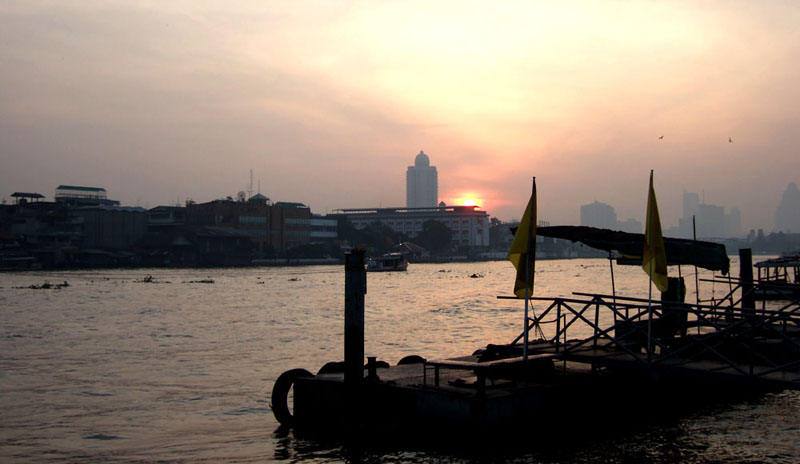 ワット・アルンの目の前に流れるチャオプラヤ川の日の出の様子