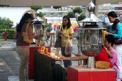 多くの人が参拝しています。日本とは少し違って、お供えするものを手に挟んで、そのままお祈りしてますね。