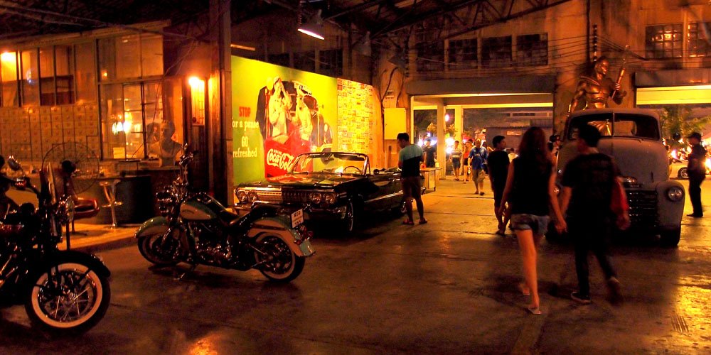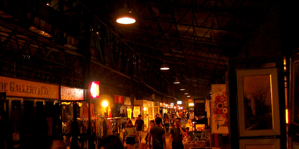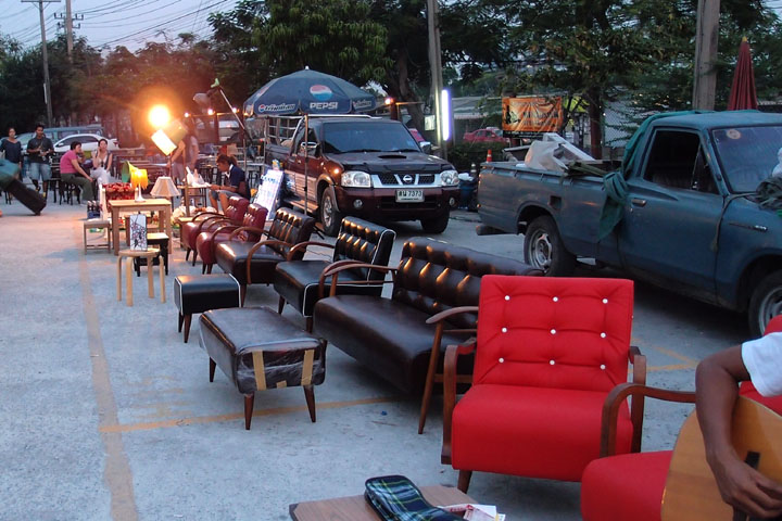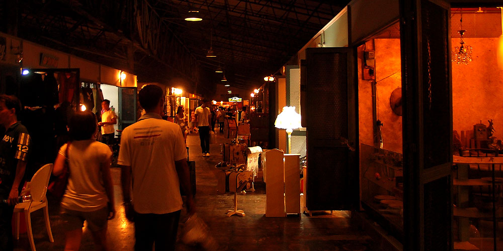 バンコクには夜市もいくつかあるようですが、ここは特にバンコクの若者を中心に人気のある夜の市場。タイ国鉄の廃車となった鉄道車両の倉庫(バンセ―倉庫)内外にお店がこれでもか、というぐらい並び、アンティークなもので一杯な「タラートナット・ロットファイ」。