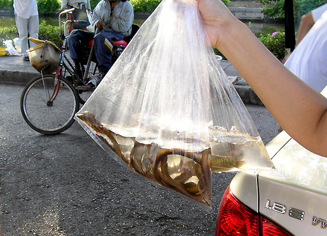 Tambun 2 (Some people sell fish outside the temple. People buy this and let them free to do tambun (accumulate virtues).) |