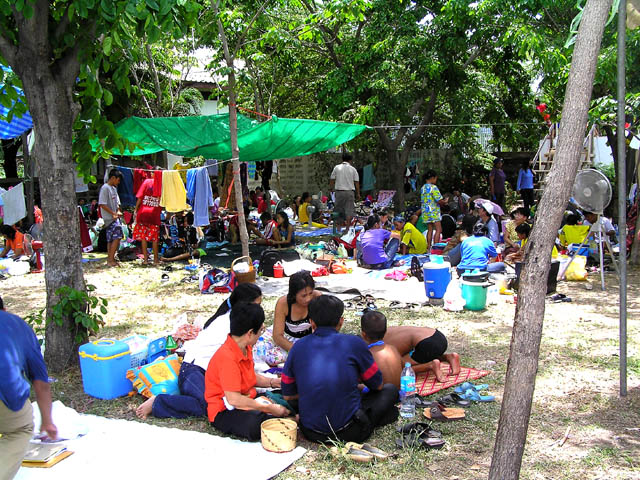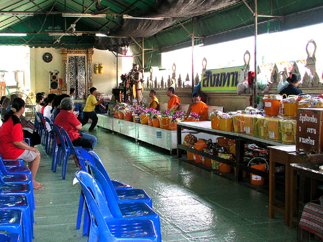 Monks and offering (Square boxes on the right, called " Kruang Sang Katan", which have daily wants inside such as something to drink, rice, yellow handkerchief and clothes. People buy and offer it to the monks.) |