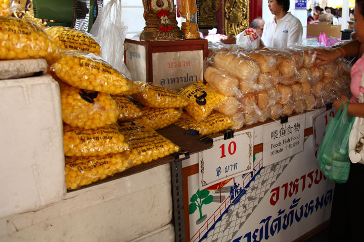 | A lot of fish Because people feed them, fish gather a lot. This scenery can be seen often around temples in Thailand. |