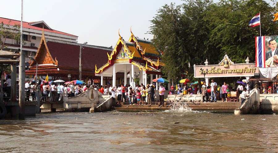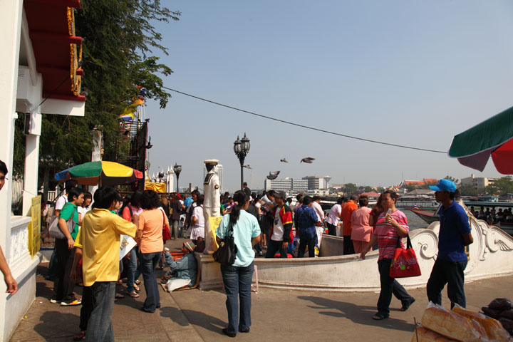 | Wat Rakhang from a boat. | Wat Rakhang from a boat. A lot of people are feeding fish in the river. |