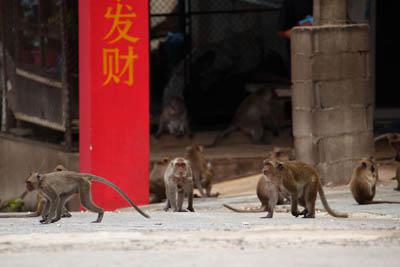 Monkeys Many monkeys are here and there around the red temple gate. |