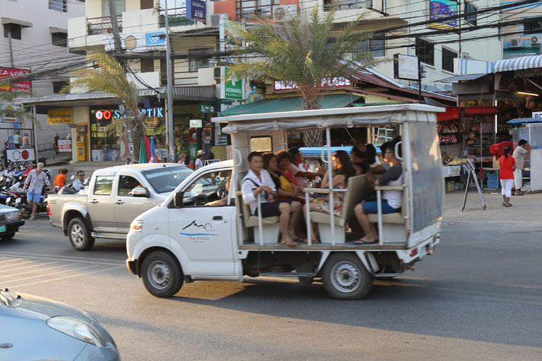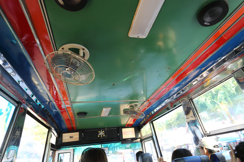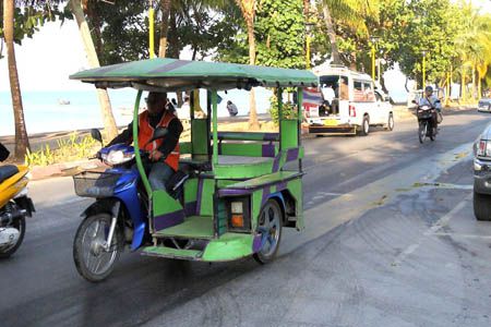 | Various cars You'll see various cars on the street. The red bus is cute like a post office car in Japan. I didn't see tuk-tuk here but instead I often saw easy taxies like a sidecar. |