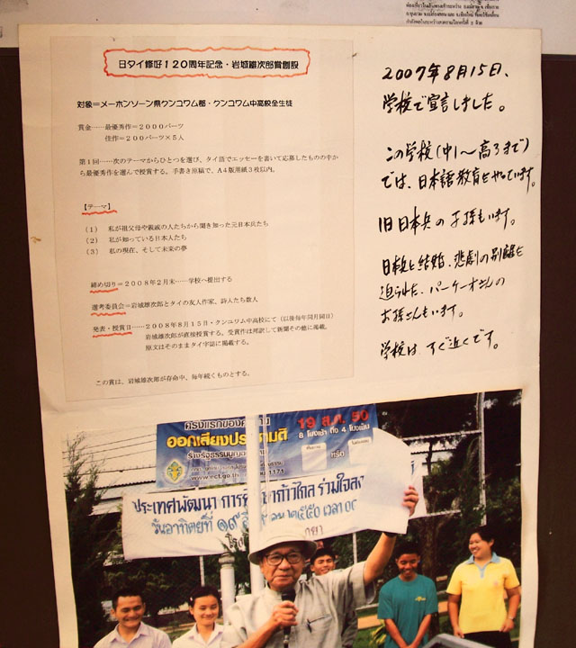 This is the Khun Yuam World War II Japanese War Museum opened on November 9, 1996, in Mae Hong Son in northern Thailand.This museum collects Japanese army artifacts in the Burma War and their theme is to clear the truth of the last war, different from the museum in Kanchanaburi which shows cruelty of Japanese troops. In this area, it's said that local people took good care of tens of thousands of soldiers who retreated from their disastrous defeat at the Battle of Imphal. The relationship between the local people and Japanese soldiers were very good. The founder is Chiedchai Chomthawat, deputy police superintendent at the Khun Yuam police station. When he became the deputy police superintendent in 1955, he went around to say hello to the residents in the area and found that each house held mementos of Japanese soldiers as their treasures. He then got to know Japanese soldiers had lived in Khun Yuam for four or five years and felt sorry that the facts of Japanese soldiers were getting lost in the minds of old persons. This lead to the construction of the museum later. We visited here in 2009, and I heard that a new building has been opened already as "THAILAND-JAPAN FRIENDSHIP MEMORIAL". At first, I didn't know there was a this kind of museum in Mae Hong Son but my wife checked beforehand for me and we dropped by here on the way to Mae Hong Son from Chiang Mai. Thanks. :D It's in Japanese and a little in English but if you are interested, check the url below: