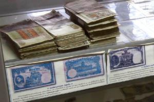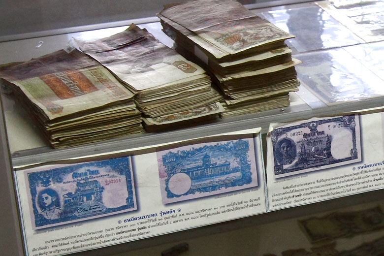 A poem by Yujiro Iwaki, a scholar of Thai literature is shown on the wall. | Old bank notes They are old Thai bank notes. |