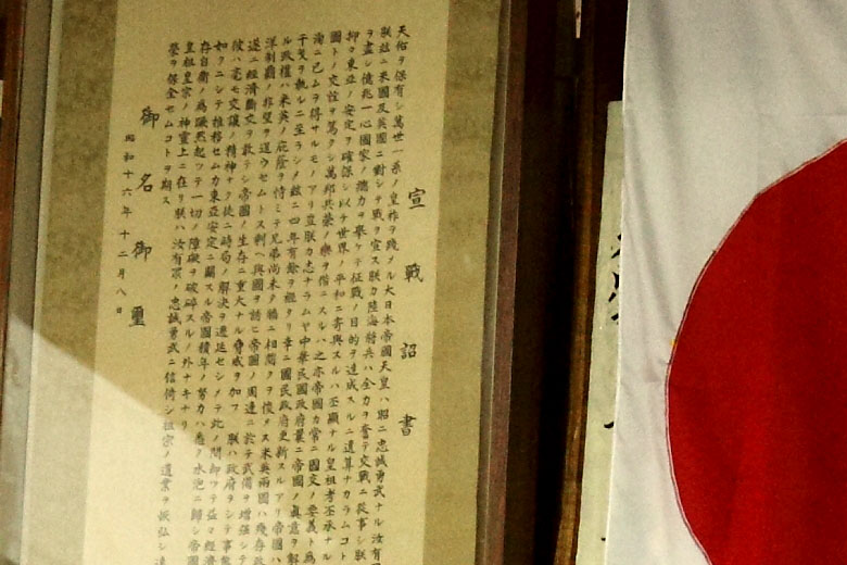 | National flag and the Imperial rescript of declaration of war The Imperial rescript of declaration of war against the United States and England (in the center of the picture) . |