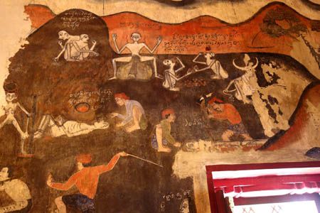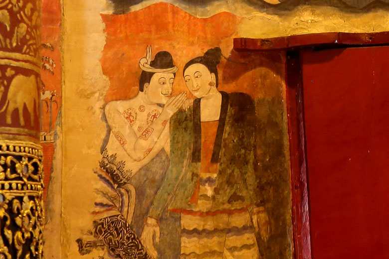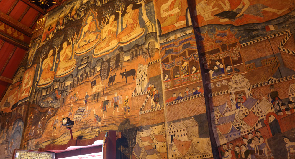 The famous painting inside the hall, showing Jataka (story of Lord Buddha), folk story and the way of life of the Nan people in the past. |