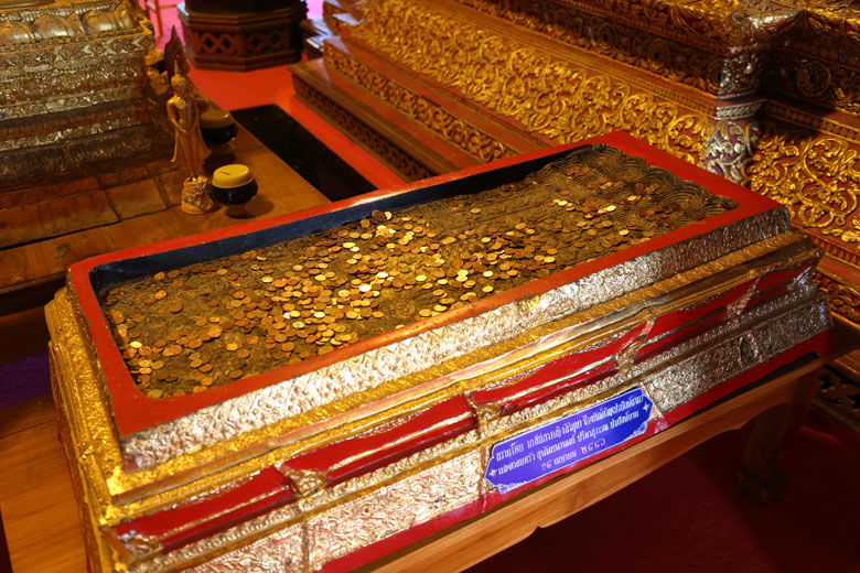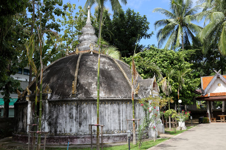 A chedi is on the left hand and the building on the right has Buddha images enshrined inside.