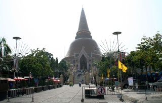 end of 2006. "Pra Pathom Chedi" is one of the main royal temples and located in Nakhon Pathom, about 60 km west of Bangkok. The huge orange tiled chedi is about 120 meters high, 65 meters in diameter and stands on the base, 240 meters around. Nakhon Phanom is the place where Buddhism was introduced first in Thailand. Around the 3rd century B.C., King Asoka sent missionaries here to spread Buddhism and the original chedi was built. Although the chedi was destroyed by Cambodia in 11th century and left deserted, Rama 4 found it and commanded the reconstruction of a new huge pagoda covering the original one in 1853. It took about 20 years to finish it until the reign of Rama V. During the era of King Rama VI, Phra Pathom Chedi was renovated and the temple became the royal temple of King Rama VI. The relics of King Rama VI are housed in its base. As the birthplace of Thai Buddhism, Nakhon Phanom has a big festival on a night with a full moon in November every year with a lot of people from all over the country. |