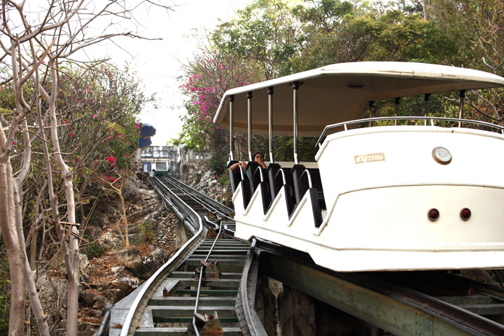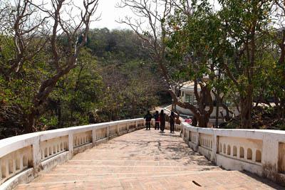 peak is 95 meters high.There are three peaks, the western, the central, and the eastern peaks, and the palace on the western peak, the chedi on the central peak, the temple on the eastern peak can be seen. This mountain (or hill) was called "Khao Samon" (Samon Hill) long time ago. ("Khao" means "hill" or "mountain".) After the Phra Nakhon Khiri Palace was built by Rama IV, this mountain turned to "Nakhon Khiri". However, people still call it like in the old way, "Khao Wang" (Palace Hill). ("Wang" means "palace".) You can go up by cable car. (I don't know if there is a walk way up to the top.) Now, here we go ! :D |