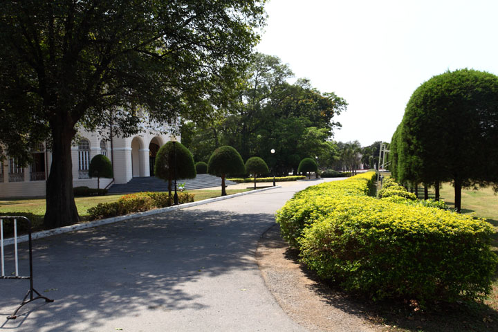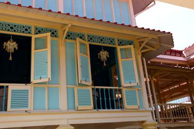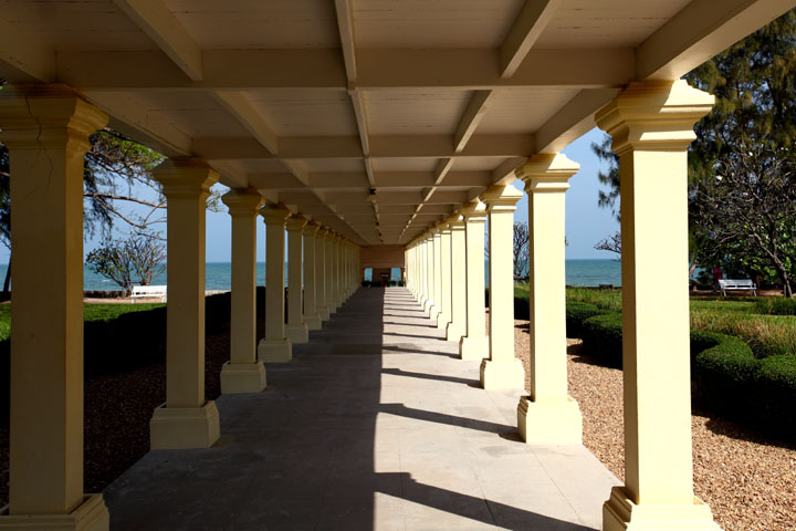 An Italian architect was hired to design the palace.Talking of palace and teakwood, you may come up with the "Vimanmek Mansion Palace" in Bangkok, however, this palace, Maruekhathaiyawan Palace, is a one-story building and has a total of one thousand and eighty pillars with three parts of the area: the area for the royal family in the right, for the royal retainers in the left and the area for the reading room, sitting room and drawing room around the center. The passage to the ocean and small buildings on the beach are very impressive. |
