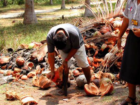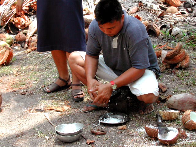 The man cracks the coconut and shows how to get milk from a coconut. |