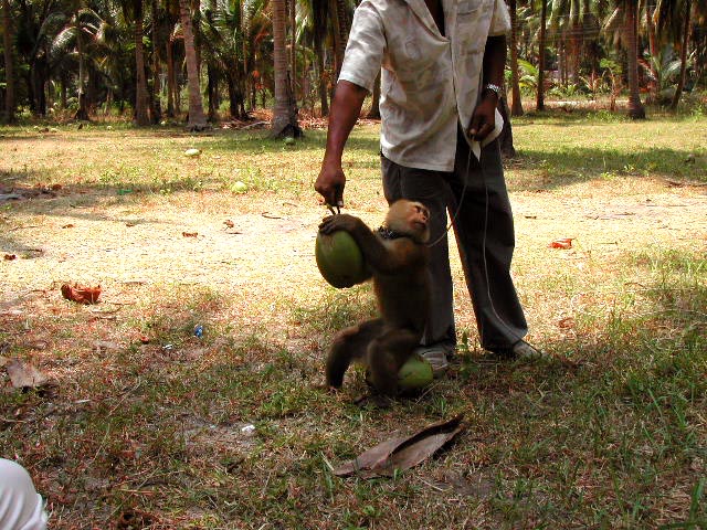 The monkey climbs up a tree and get a coconut. This is not only a show but they still get coconuts like this with a