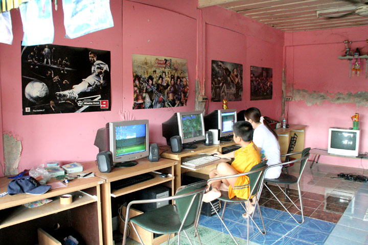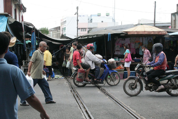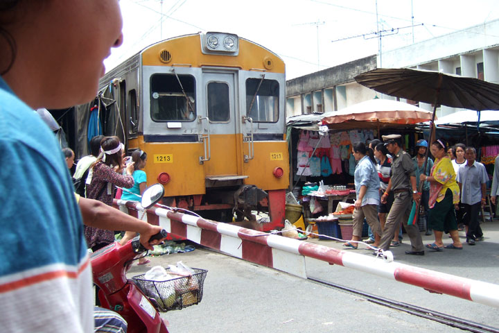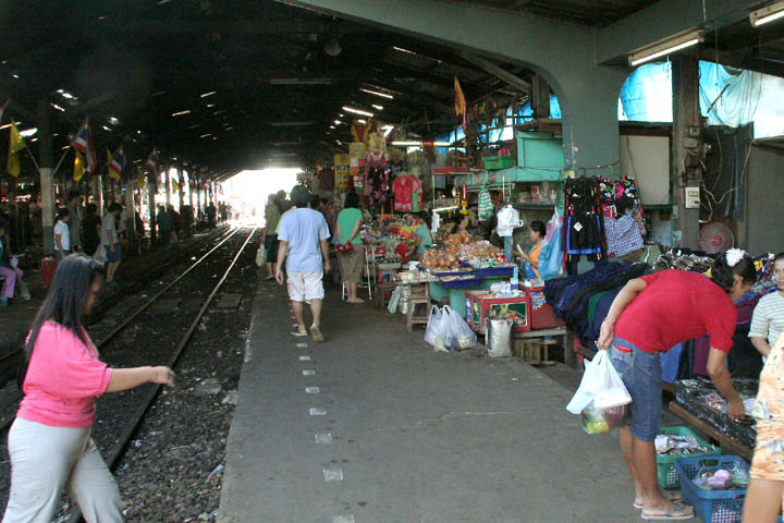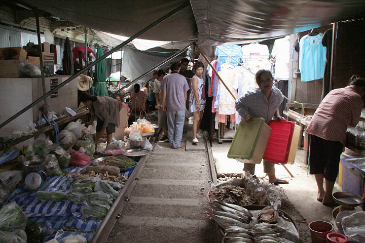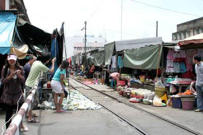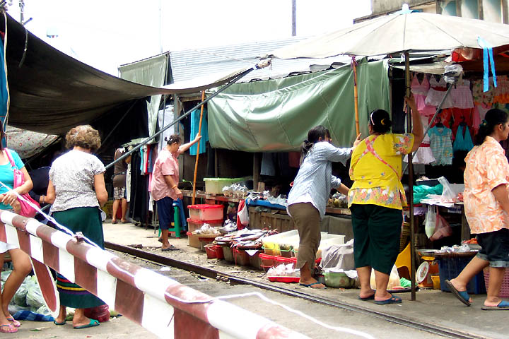 (After the train passed, they put bask the sunshades and goods quickly to the right place.) |