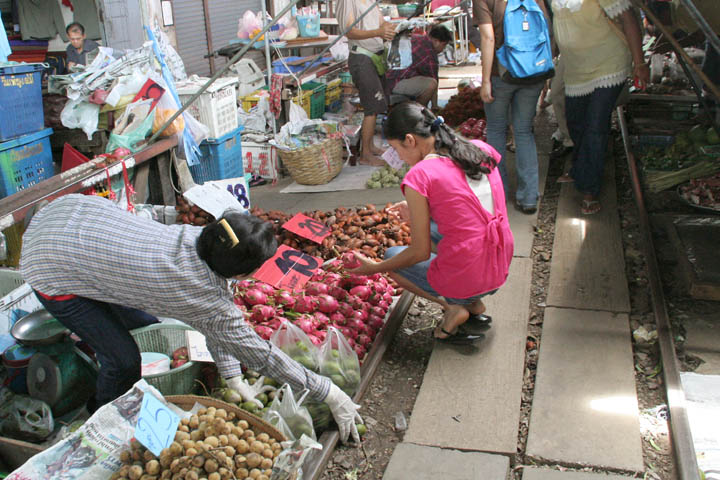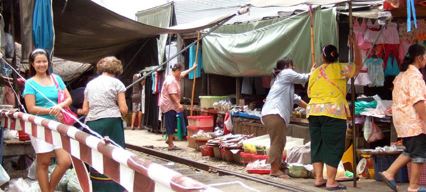 (Under the sunshades, they are selling various kinds of goods such as fruits, vegetables, clothes and fish along the railroad.