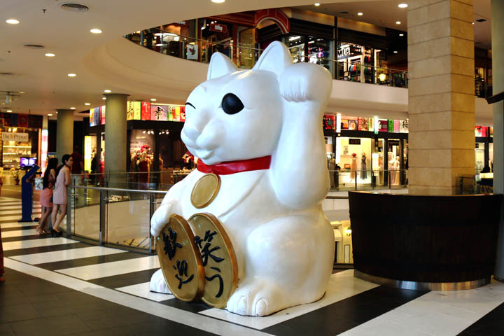 Welcoming cat and shrine gate. "笑う" of the cat is kind of funny