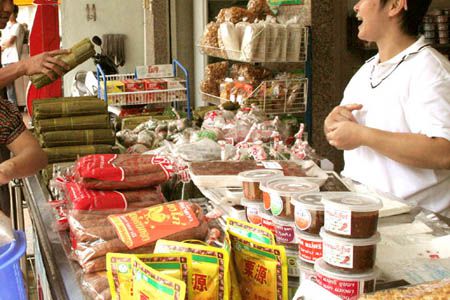 The ones covered by like bamboo leaves are pork and called Muu Yor.) |