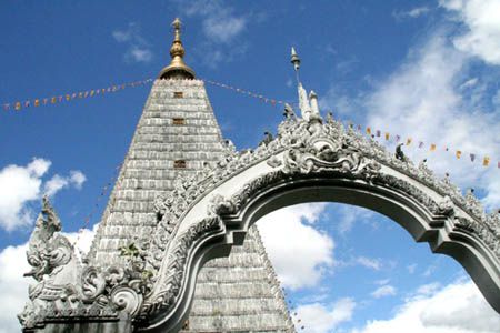 Modelled on the Mahabodhi temple in Bodh Gaya of India where the Buddha