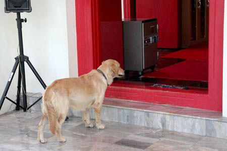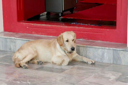 the dog was just waiting in front of the entrance. Good manners .. ? :)