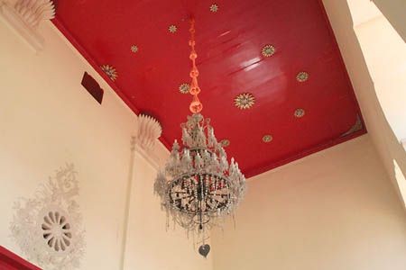 (Chandeliers are decorated on the ceiling.) |