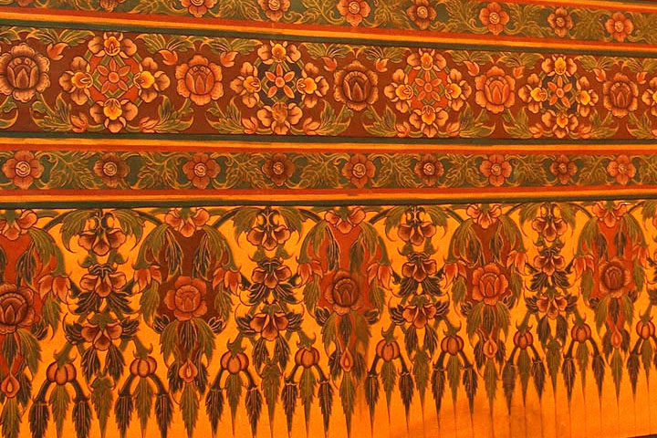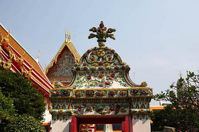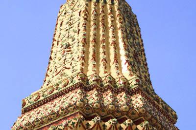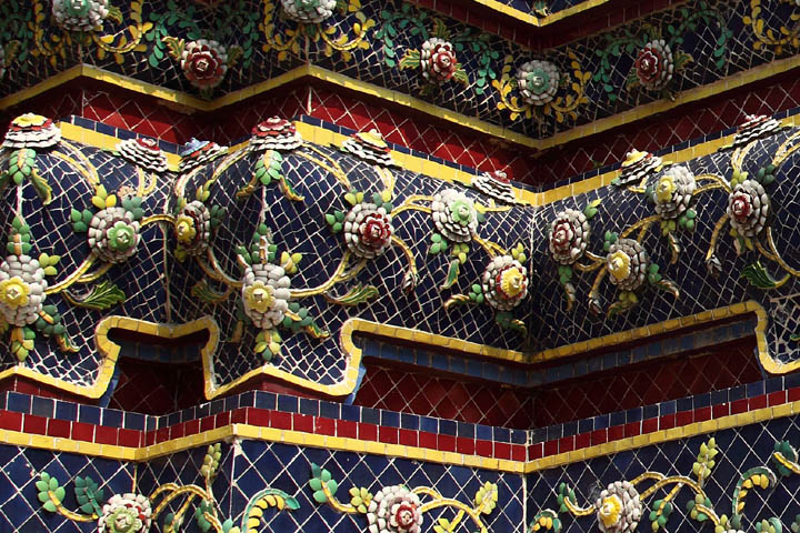 Maha Chedi Si Rajakarn, is very famous; each chedi is 42 meter high and colorfully decorated with tiles.Each of the four Chedis was built to commemorate the reigns of King Rama I to IV of the Chakri Dynasty (current dynasty) and it's said that the green is for King Rama I, the white is for King Rama II, the yellow is for King Rama III and the dark blue is for King Rama IV. By the way, I think the colors indicates the colors of the bases. The King Rama IV ordered to enclose the four chedis with no extra space for more chedis because the four Kings met each other and lived in the same period. |