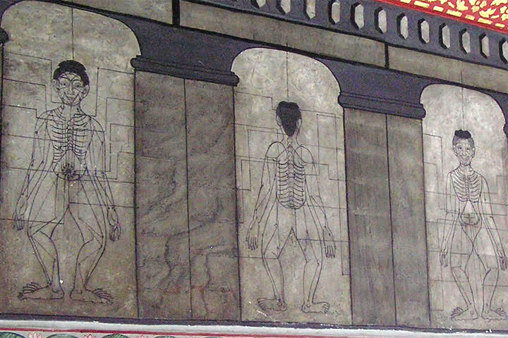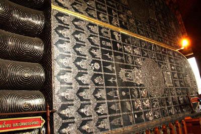 The Sole Of The Reclining Buddha Very big foot; 5 meters long and 1.5 meters high. The sole of each foot are exquisitely decorated with 108 sacred scenes of Buddhist enlightenment in Chinese and Indian styles in mother-of-pearl inlay. |