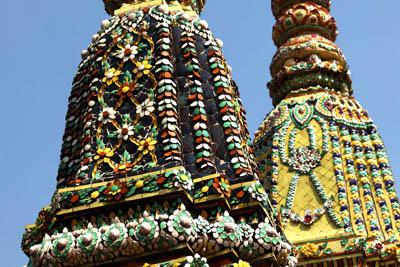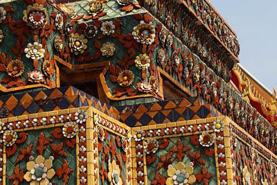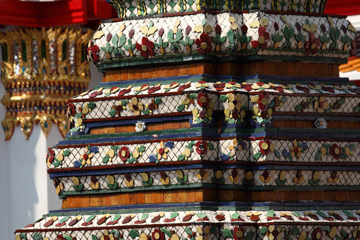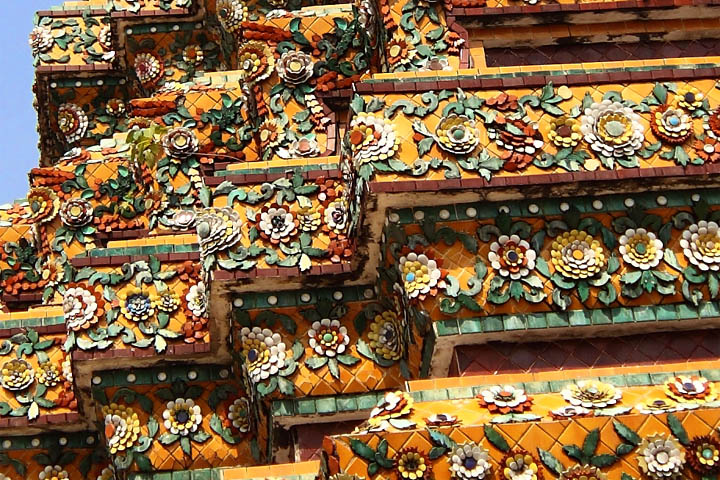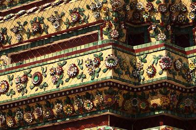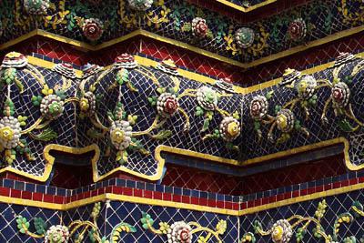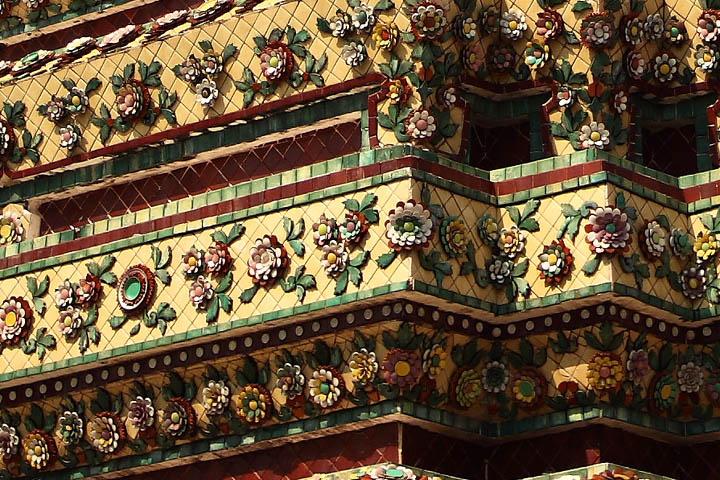 | Chedi 3: Rama III Phra Maha Chedi Muni Batborikharn. The chedi is decorated in yellow-based color with flower shaped tiles. |